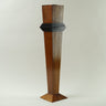 A smaller teak wood cone with a band of step like strips is finished with a brass plate at the top to create a candle stand that echoes unmistakeable style.