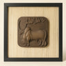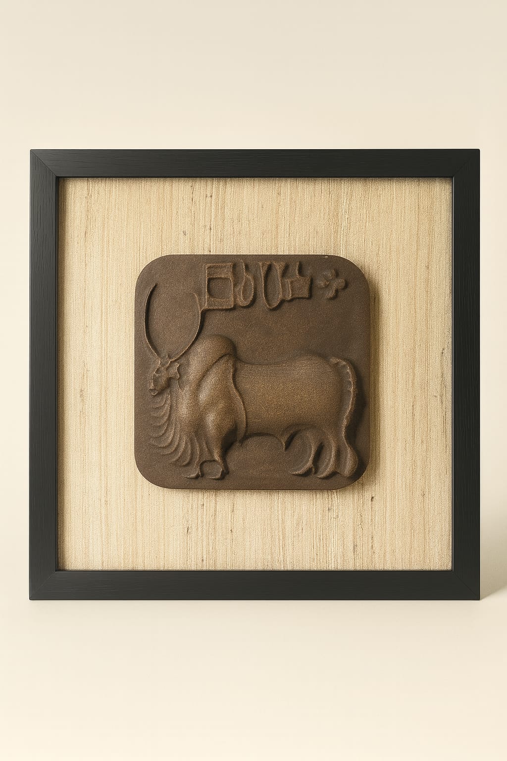 This stone tablet from our Mohenjo daro series depicts a yak with tall horns and is characteristically marked by the ancient script of its time.