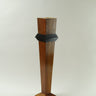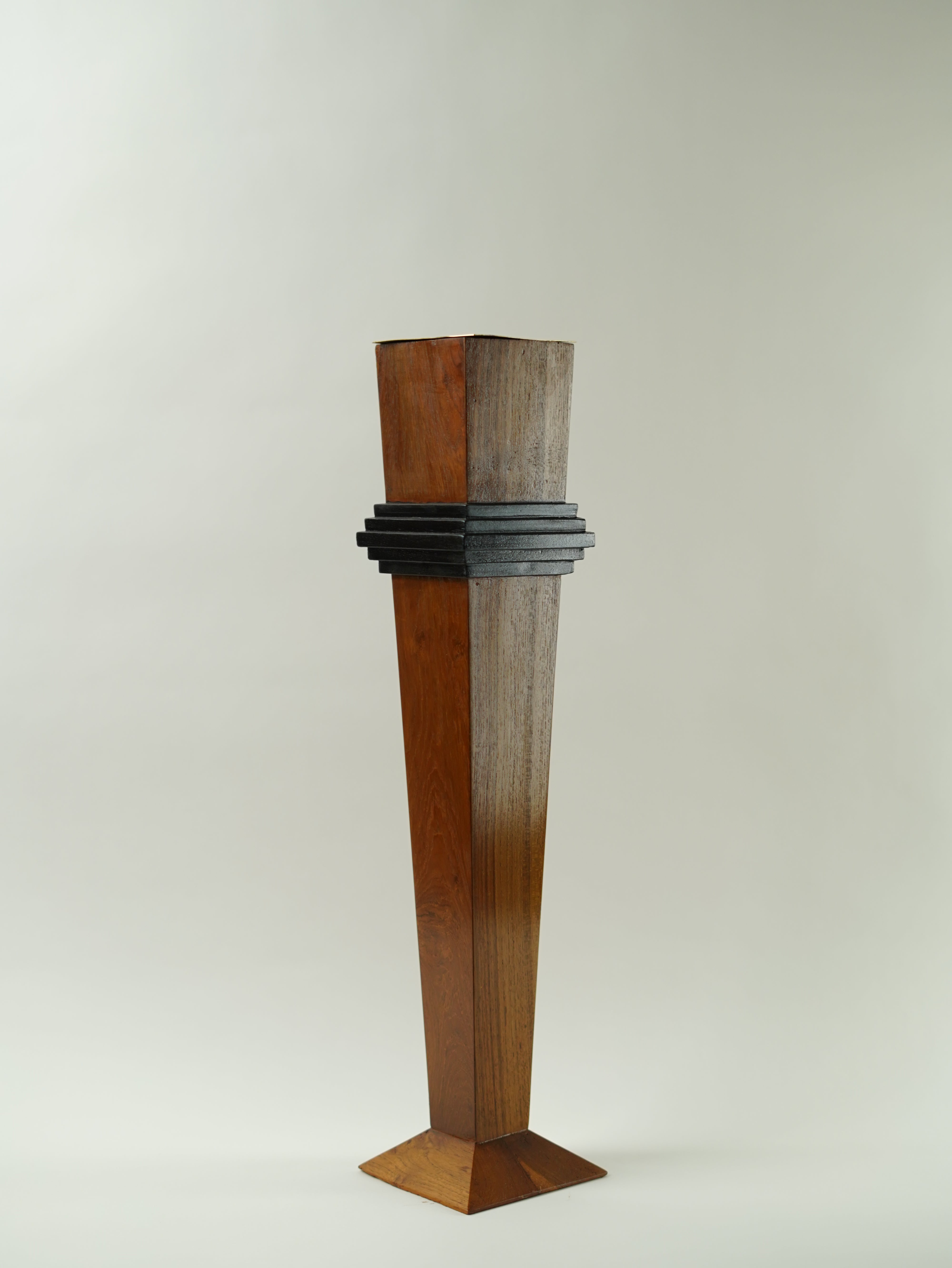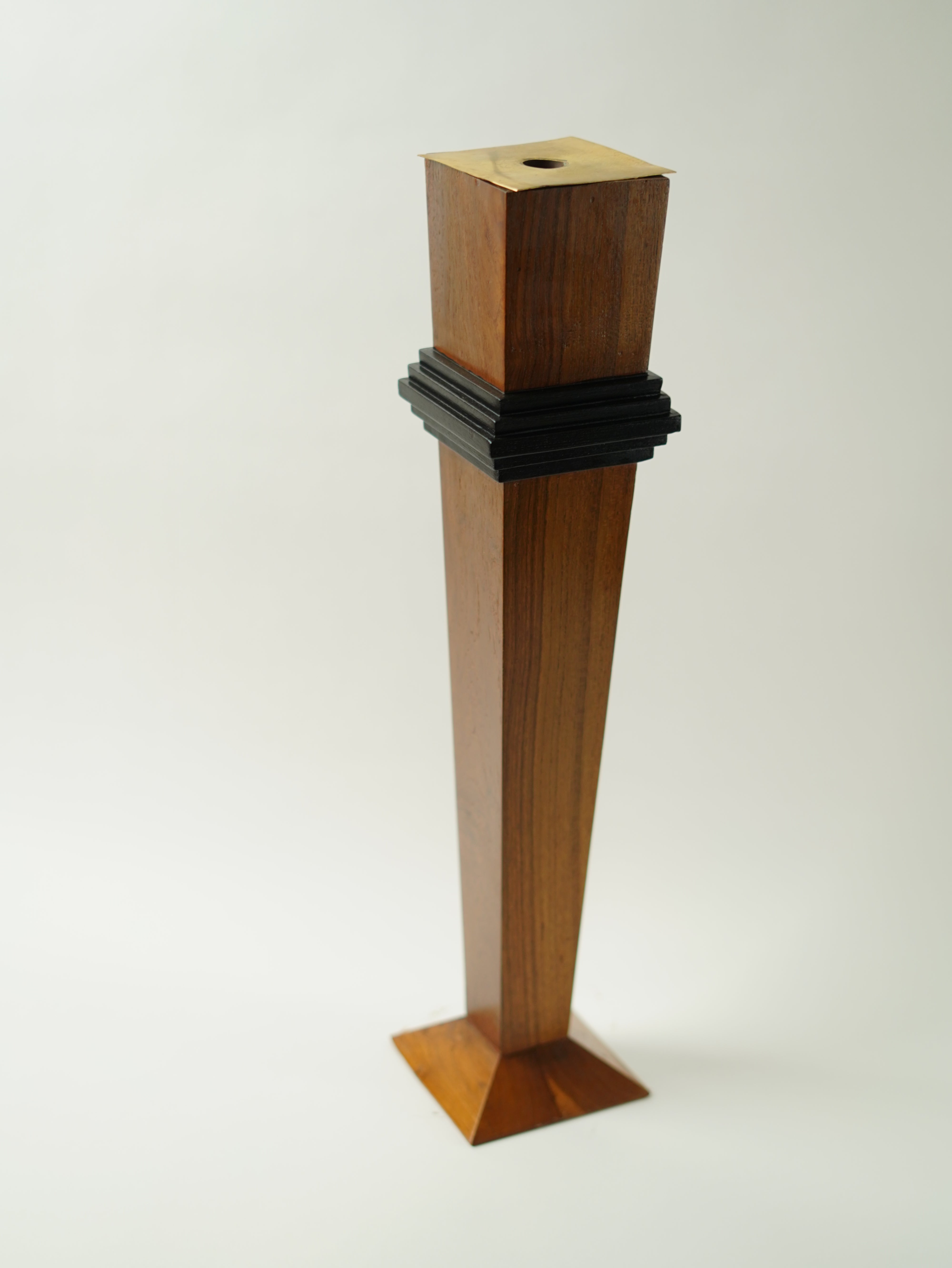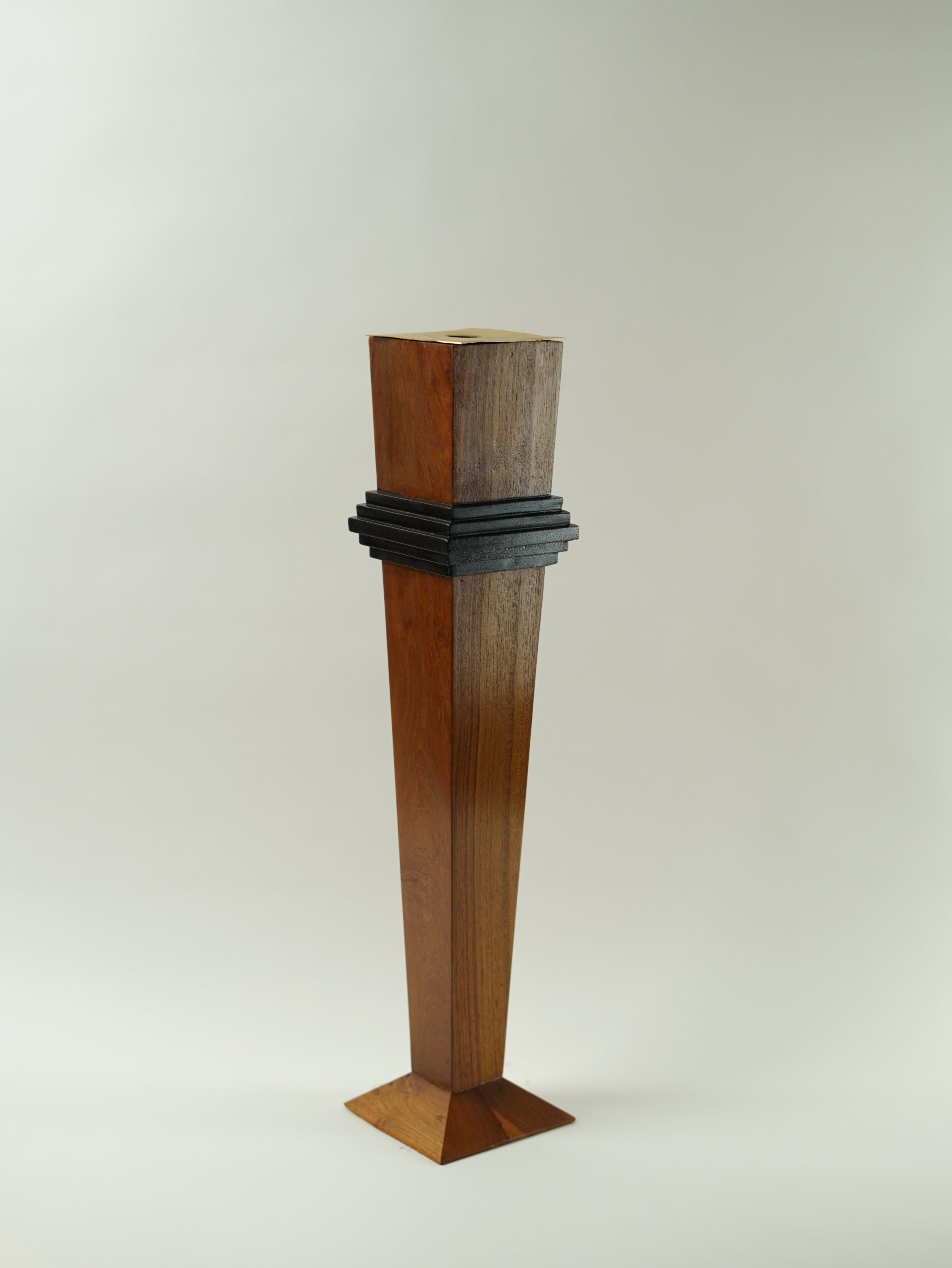 A smaller teak wood cone with a band of step like strips is finished with a brass plate at the top to create a candle stand that echoes unmistakeable style.