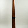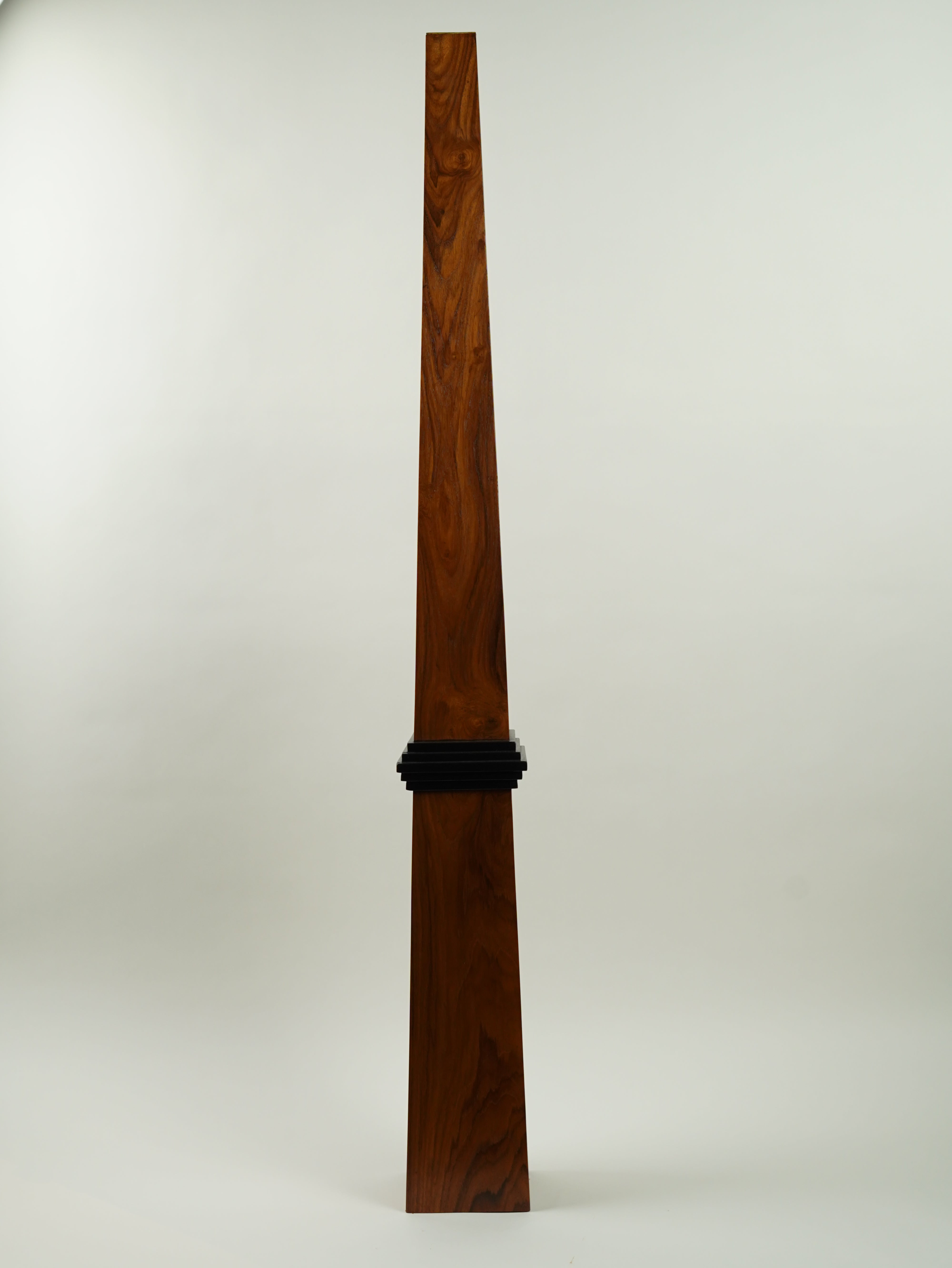 A totem pole like candle stand in teak wood is accentuated by a band of strips cast in a step like form.